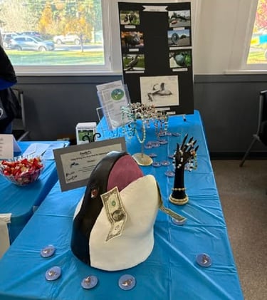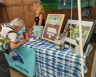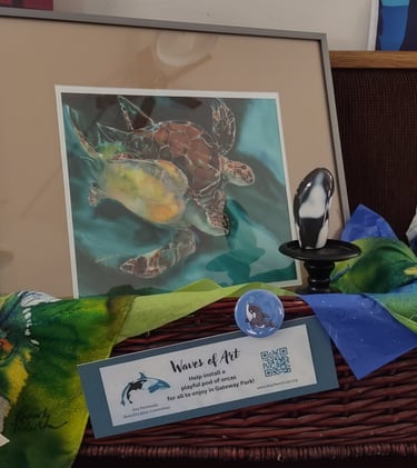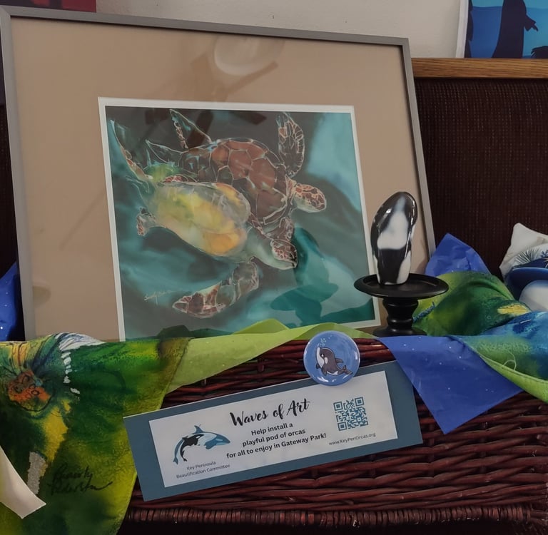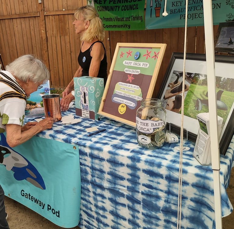 ARTWALK 2025- The Gateway Pod of orcas is introduced to art lovers of the Key Peninsula. Their creativity and cleverness selects a name for the pod's baby: she is named Key Key!